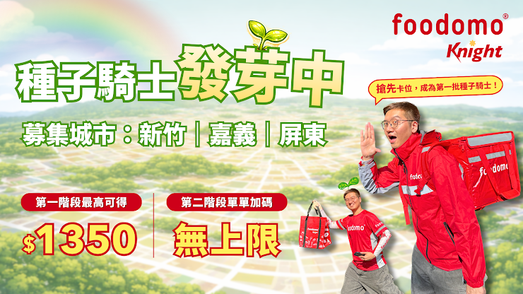2026年4月加入 foodomo 騎士行列,不僅享有統一集團穩定訂單,除了原有的雙北、桃園、台中與高雄,4月將擴大服務範圍,正式啟動「區域種子騎士計畫」,強勢插旗新竹、嘉義、屏東!現在正是南部與新竹朋友搶先卡位、成為第一批種子騎士的最佳時機。
