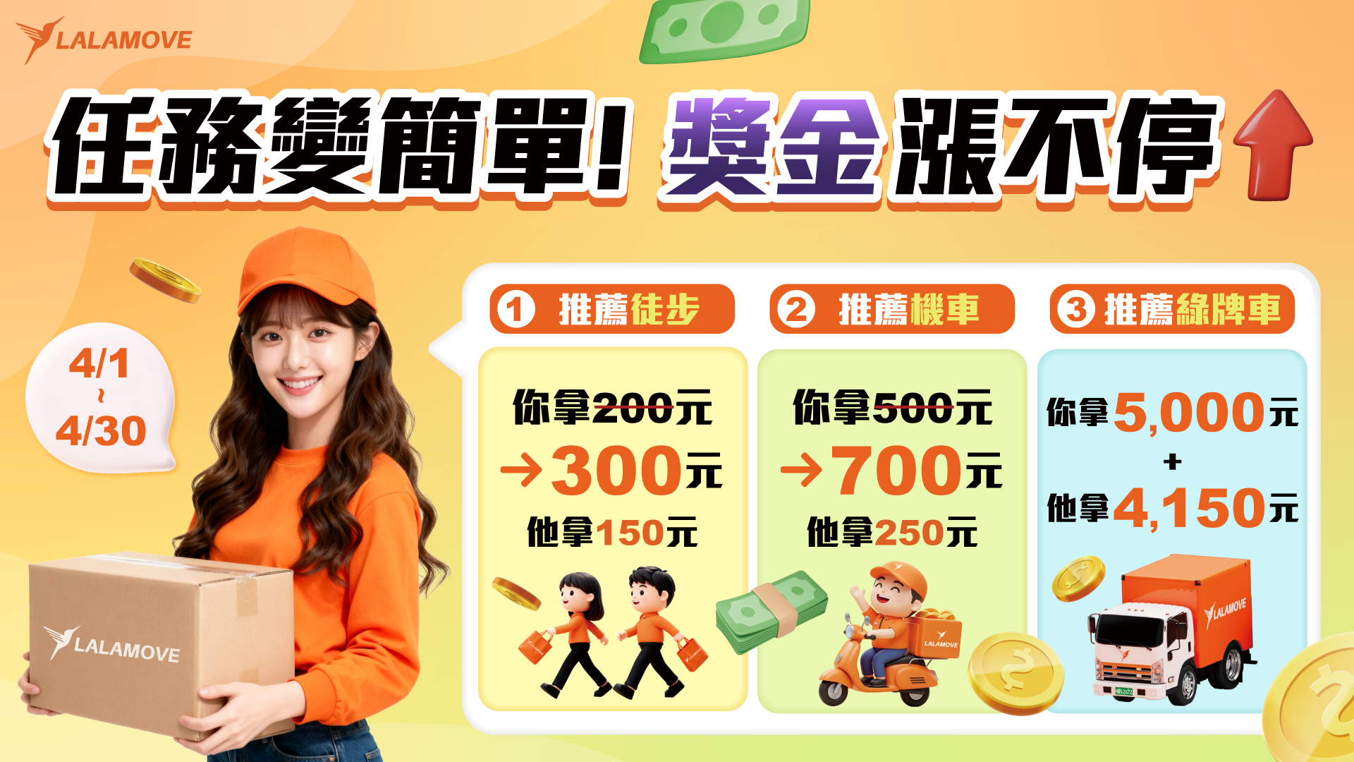 即日起至4/30以前,現職Lalamove司機夥伴"使用您的推薦碼",推薦親友加入Lalamove機車、徒