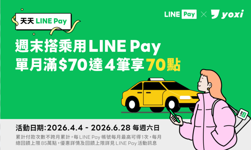 | 下車時透過 LINE Pay 付款📌單月累計 4 筆且 4 筆交易實際支付金額皆滿 70 元(LINE POINTS及優惠券折抵金額不計入)即可享LINE POINTS 70 點回饋!(每月限量85萬點,發完為止)活動期間內的每週六及週日適用 | 免輸碼直達(點擊前往) | 4/4 ~ 6/28 | 所有用戶 |